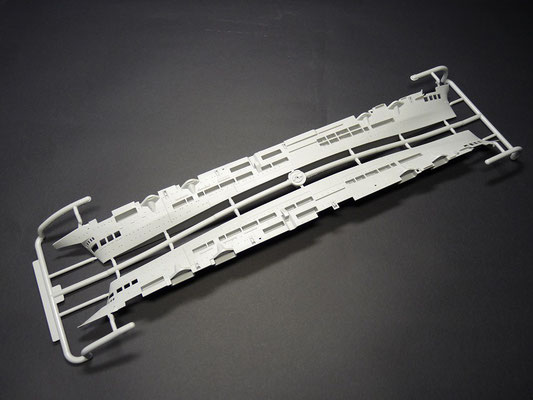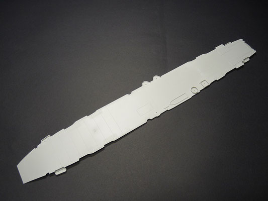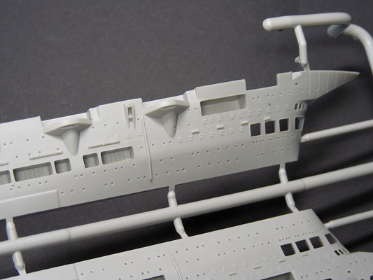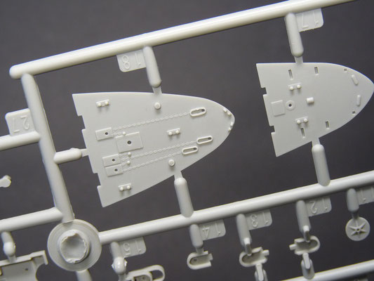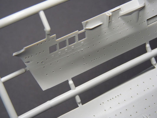 Der Rumpf ist in zwei Hälften geteilt und ist eine Augenweide, nur schade das es kein Vollrumpf ist sonder nur bis zur Wasserlinie reicht. Kein Verzug oder irgend welche Ungereimtheiten alles sehr sauber ausgegossen. Das Deck und die Insel sind auch wieder erste sahne da man auch die Fangseile und Lifts sehr gut wieder erkennen kann. Plattformen so wie die Geschütze und Beiboot sind sauber ausgearbeitet worden nur die Flak sollte man vielleicht gegen Ätzteile austauschen da sie von den Geschützlauf zu grob wirken, aber dies ist nicht zwingend notwendig da es hier um eine Komplett neue Bausatzform handelt.